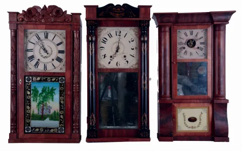 (1) Refinished mahogany veneered case with restoration to the stenciled columns and splat. Original painted dial with wear at winding arbors. Original hands and mirror. Good label inside the case. (2) Mahogany veneered case in old finish. Original painted dial and hands. Tablet is a replacement. Good label. (3) Refinished mahogany veneered case with small loss on the base. Original painted dial with loss. Replace hands, tablet and mirror. Original movement, nice "Puffing Betsey" label.