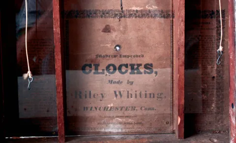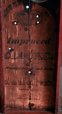 Clocks- 3 (Three) American: (1) C. & L. C. Ives, Bristol, CT 30 hours, time and strike weight driven wood movement half column & splat shelf clock, c1832. (2) Riley Whiting, Winchester, CT 30 hours, time and strike weight driven wood movement carved half column & splat shelf clock, c1830. (3) John Birge & Co., Bristol, Ct., 8 days, time and strike weight driven brass movement Column & Cornice shelf clock, c1848. (1) Refinished mahogany veneered case with restoration to the stenciled columns and splat. Original painted dial with wear at winding arbors. Original hands and mirror. Good label inside the case. (2) Mahogany veneered case in old finish. Original painted dial and hands. Tablet is a replacement. Good label. (3) Refinished mahogany veneered case with small loss on the base. Original painted dial with loss. Replace hands, tablet and mirror. Original movement, nice "Puffing Betsey" label.