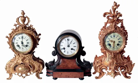 (1) Cast metal case gold finish has mellowed. Original porcelain dial is perfect with original hands. There is no pendulum. (2) Burl walnut with carved dolphins and ebonized molding in original finish with some roughness to the front molding on the base and a little wear to the finish on the wood bezel. The tip on the tail of the right dolphin is broken off. Original porcelain dial is chipped at the winding arbors. Minute hand is a replacement. (3) Nice gilt rococo case. Original porcelain dial is perfect with original hands.