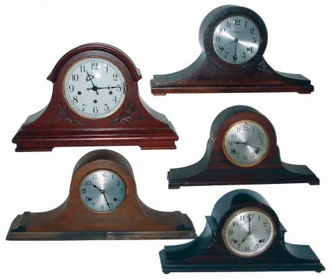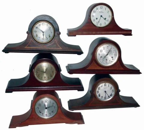 Clocks- 11 (Eleven) tambour mahogany, 8 days, time and strike mantel clocks, 3 also Westminster chime: makers include Seth Thomas, Sessions, Ingraham, New Haven, Waterbury, and Colonial. 20th century