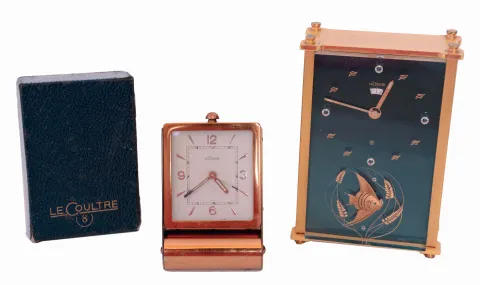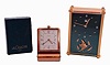 Clocks- 2 (Two): Both LeCoultre, the first a ref. 2173 musical alarm clock, gilt case with lucite dial, and gilt luminous stick hands, the other a folding travel alarm clock, lacquered brass folding case with Arabic numeral and arrow marker metal dial and
