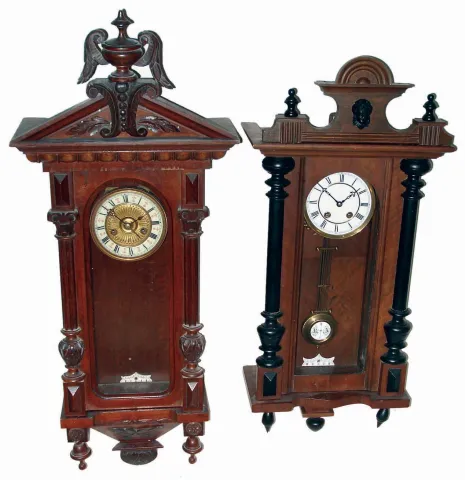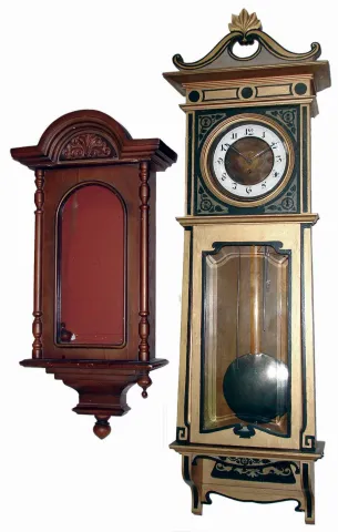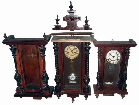 Clocks- 5 (Five) German, 8 days, time and strike wall clocks plus 2 (Two) cases with no movements: larger decoratively painted clock has 3-weight quarter-striking movement, early 20th century many useful parts and perhaps enough for complete clocks, but sold as is with no further details available. Ht of 3-weight is 45"