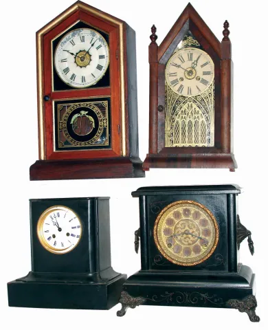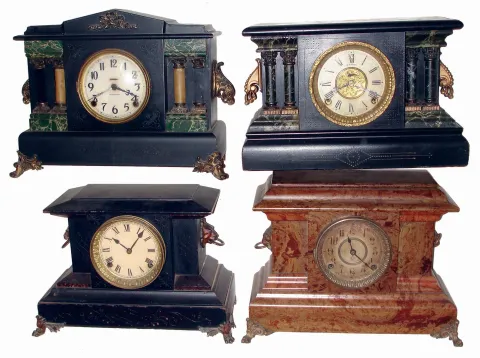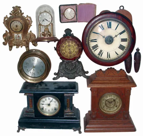 Clocks- 17 (Seventeen) mantel and wall clocks: 5 Connecticut, 8 days, time and strike black mantels by Sessions and Ingraham; Seth Thomas Adamantine, 8 days, time and strike; German Black Forest hanging 2 weight postal clock; German quartz anniversary; Waltham, 8 days travel; Ingraham oak, 8 days, time and strike cabinet; New Haven shelf, 8 days, time, strike & alarm; Jerome, 30 hours, time and strike, small steeple; French black marble, 8 days, time and strike mantel, Japy movement; 2 cast metal rear-wind mantels; Sessions brass case marine clock, now with quartz movement and a Seth Thomas modern chiming grandmother clock in a maple case; mostly late 19th century Various conditions with some losses and damage. The Seth Thomas tall clock is missing the pendulum leader. Sold "as is" with no further details available.