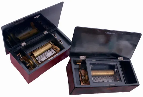 the larger box is nicely inlaid and has been repainted black inside. The smaller box also has been restored with stain and paint, is missing its inner lid, and has some comb damage. Both play a choice of tunes, but only with coaxing and will need service. There are no printed tune cards. The box outer dimensions are 17" x 7 1/4" x 5.2" and 15" x 7" x 5"
