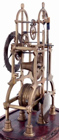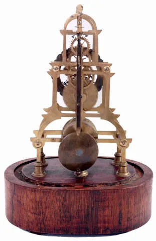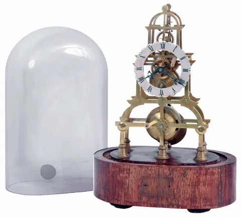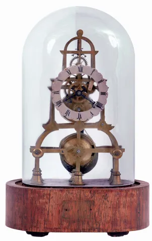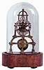 English, single fusee skeleton clock, in a rafter frame, with scalloped & silvered brass dial, with a glass dome, c1890 the chain was replaced with gut long ago and is now failing, you can just wind it enough to get a "tick". This clock came to us from storage and will need cleaning. Needs new suspension spring. The dome is clear and unchipped, but does not fit wood base profile exactly. Ht 12"