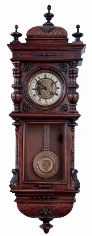 Germany, smaller walnut cased spring "Vienna" regulator, double door style, with embossed dial center bearing a cherubs face below 12, and the embossed pendulum with a similar large central cherubs face. 8 days, time and gong strike, c1900