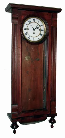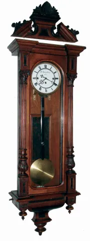 Clocks- 2 (Two) walnut 8 days, 3 weight quarter striking Vienna regulator wall clocks; 1 German by Gustav Becker; 1 Austrian unsigned movement with porcelain dial signed "M. Kerz & Sohn, Wien", c1880 absent pieces include a top crest, pendulum, lower finial, and all six brass weights. The existing top crest needs new dowel posts. Not tested, sold as is with no further details available. Hts 34" and 52"