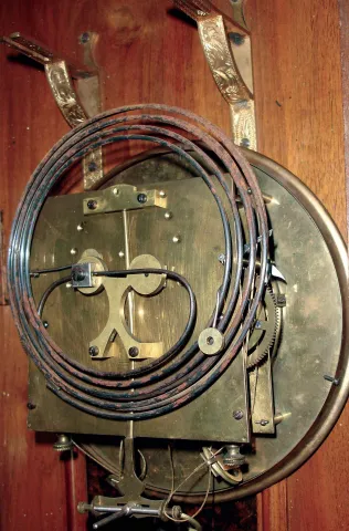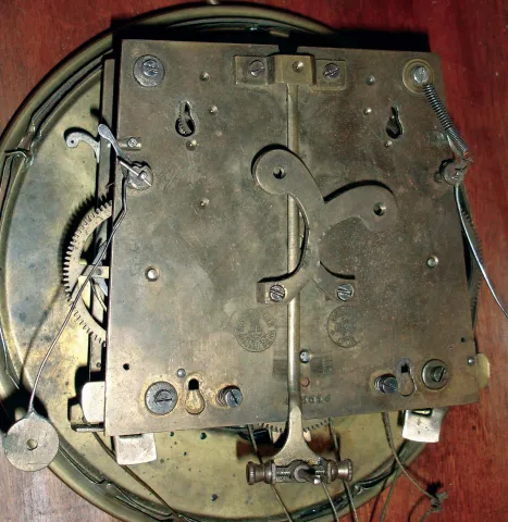 absent pieces include a top crest, pendulum, lower finial, and all six brass weights. The existing top crest needs new dowel posts. Not tested, sold as is with no further details available. Hts 34" and 52"