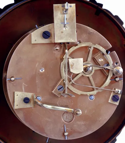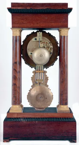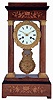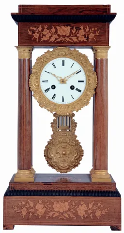 France, portico clock, rosewood veneered case with contrasting stringing and floral inlays, columns with gilt capitals and bases, top and base with ribbed, ebonized quarter round molding, gilt bezel and pendulum with leaf and scroll design, Roman numeral white enamel dial, gilt hands, 8 days, time and strike pendule a Paris movement marked Vincenti and Roblin a Paris, c1870 veneer with fading, minor scratches and scrapes, minor lifting at top right and minor loss at top rear, ebonized moldings with minor roughness, dial restored, gilt components good, bell replaced, ticks and strikes, 19 1/2"h x 10 1/4"w