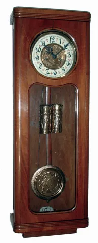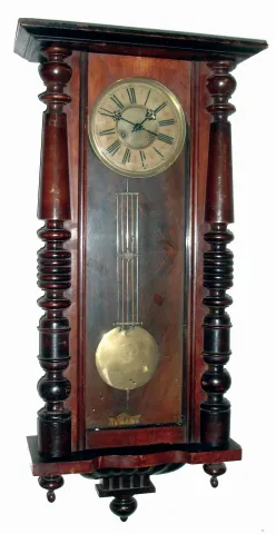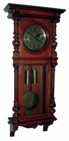 Clocks- 3 (Three) German walnut, 8 days, time and strike, Vienna regulator wall clocks: 1 Mauthe spring wound; 2 weight driven by Kienzle and Becker, c1900 all three in good condition with old finishes, but the two that had crests are missing them, and there are veneer losses and age splits. Two pairs of brass weights included. The paper dial of the Mauthe is quite worn. Sold as is, no further details available. Hts 40", 34", and 39"