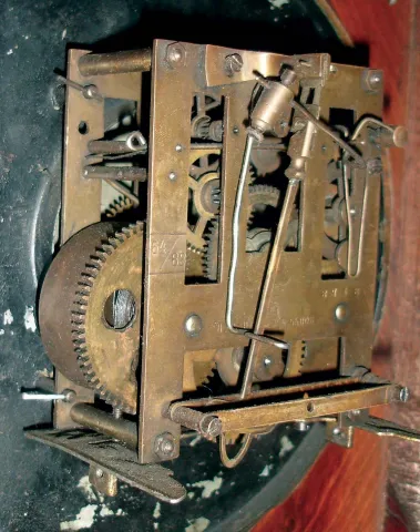 all three in good condition with old finishes, but the two that had crests are missing them, and there are veneer losses and age splits. Two pairs of brass weights included. The paper dial of the Mauthe is quite worn. Sold as is, no further details available. Hts 40", 34", and 39"