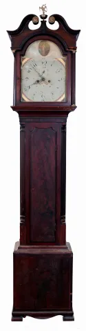 there is veneer, inlay and molding absent, although some is present in a bag with the clock. Left column on hood is absent. Dial has darkened. Ht 91", Width 18 1/2", Depth 9 1/2"