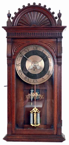 Unknown maker, "Mystery" program clock, 8 days, time only spring wound oak wall clock, weekly program unit, with electrical contacts, below the movement, c1930