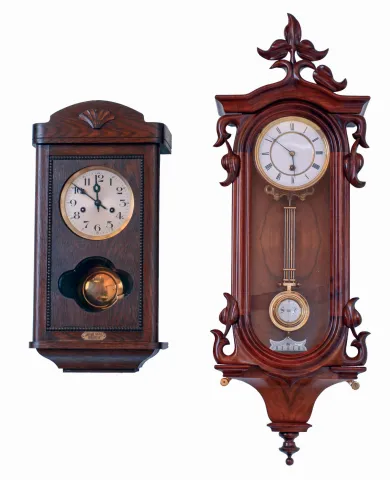 Clocks- 2 (Two) Lenzkirch Spring Driven Wall Clocks from different eras. The first is 8 days, time only with a very nice leaf accent, style #309, "R-A", serial #218007, c1871, with porcelain dial, The second an 8 days, striking Edwardian box style wall clock, c1910, in a dark oak case with beaded door trim and silvered dial. the R-A has been professionally restored and is excellent running condition. Top left leaf is absent; height, tip to tip 34" The box clock is similarly clean and running, height 22"