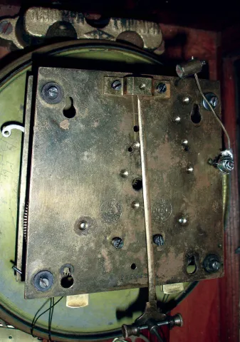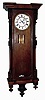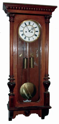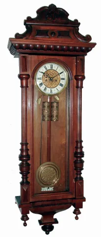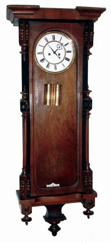 Clocks- 3 (Three) German walnut, 8 days, 2 weight, time and strike, Vienna regulator wall clocks; one Gustav Becker, one Remember, one unsigned; c1890 finishes are old, 2 of 3 top crests are absent, one pendulum and one small rosette is missing, one front glass is loose, the one crest needs a better dowel post, some finials are damaged, there are some age splits and dial hairlines. Two movements are signed on backplates. Sold as is, no further details available. Hts 51", 39" and 41"