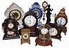 Clocks- 9 (Nine) Novelty, Porcelain, Swinger, Carriage, Mantel: includes Horolovar flying ball and Briggs rotary; modern figural swinger (Asian); 3 porcelain including Waterbury with visible escapement; French time & alarm carriage clock; and small French