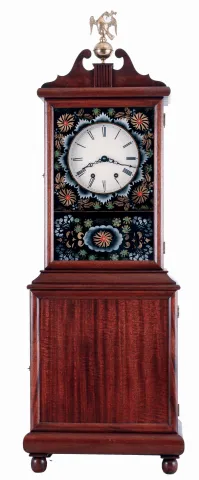 Well made mahogany case using a spring-driven instead of weight-driven movement. Nicely done reverse tablet. The hood is not removable. Ht 34"...