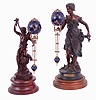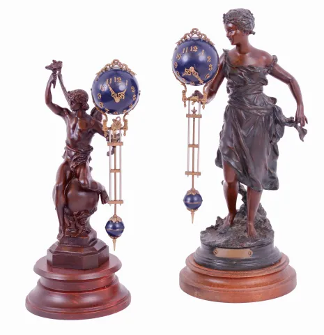 both are in very good overall condition, with nice patinas on the detailed metal figures, and the dark blue movement balls are intact. The larger clock is missing the top half of its suspension block, the other block needs repair, and neither were tested. Hts to tops of figures 15" and 13"