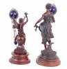 Clocks- 2 (Two) modern reproduction bronze swinging arm, 8 days, figural timepieces, on turned wood bases, c2000 both are in very good overall condition, with nice patinas on the detailed metal figures, and the dark blue movement balls are intact. The larger clock is missing the top half of its suspension block, the other block needs repair, and neither were tested. Hts to tops of figures 15" and 13"
