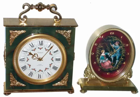 Clocks- 2 (Two) Imhof Swiss, 8 days, brass and glass desk clocks; larger with green onyx also is striking; mid 20th century both are in very good original condition, both tick and set but were not tested long term and no further details available. Ht to handle top 8 1/2"
