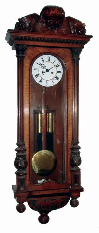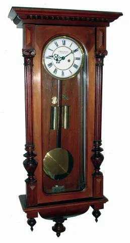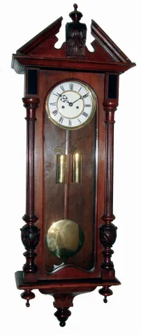 Clocks- 3 (Three) Gustav Becker, German, walnut 2 weight, 8 days, Vienna regulator wall clocks, white porcelain dials (one signed by Hamburg retailer), c1890 all three are in good original condition with old finishes and brass weight pairs. One is missing its top crest; one has no bezel around its damaged dial; one has a loose bottom bracket. All three have the Becker stamp on movement backplates. Sold as is, no further details available. Hts 46", 40" and 47"
