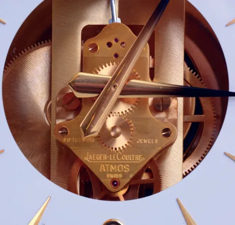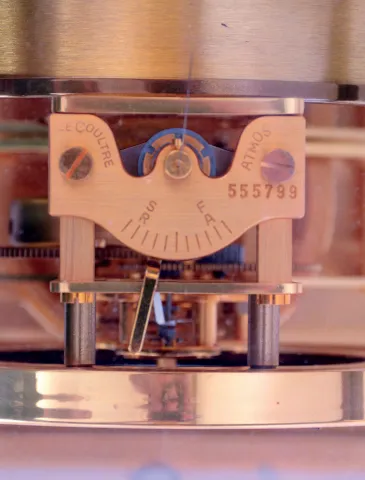 Jaeger- LeCoultre, Switzerland Atmos clock, cal.528-8, gilt, rectilinear glazed case, the base with cotes de Geneve decoration, Arabic numeral and arrow marker white painted dial, gilt hands with black tips, 15 jewel gilt movement, serial #555799, c1975