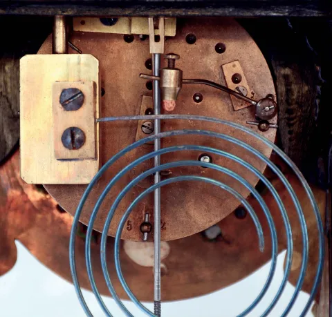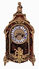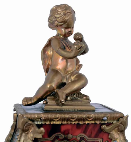 France, mantel clock, the boulle case with brass inlaid horn, dyed to imitate tortoise shell, cast foliate mounts and figural finial, cast brass dial with Roman numeral, white enamel cartouches, blued steel hands, 8 days, time and strike pendule a Paris movement, c1900 Overall very good with some minor inlay lifting. Horn with minor checking and a few small losses. Small flake in enamel cartouche at 12:00. Good hands, metal decoration and final intact. Ticks and strikes, 15 1/2"h x 7 1/2"w