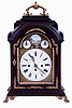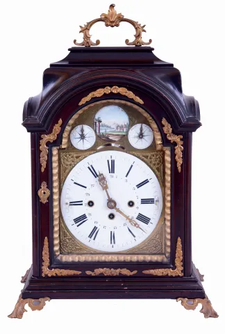 Austria, bracket clock, ebonized case with molded break arch top, molded base, cast brass feet and carrying handle, sheet brass dial with mock pendulum, gilt spandrels, Roman numeral white enamel dial, the arch with controls for the striking, and with landscape painting on enamel, pierced and engraved brass hands, case with glazed sides, and Helios mask frets, three train, quarter striking movement with verge escapement, strike trains with going barrels, time train with fusee, c1800 case refinished, feet and handle are inappropriate replacements, enamel dials with chips, hairlines and repairs, enamel painting also with filled loss, movement ticking, strike trains not running, back plate defaced by C.R. Crookshank, who stamped his name, initials, date, and location beneath the center arbor, 20"h x 14"w