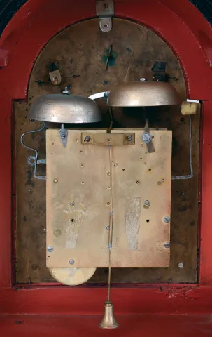 case refinished, feet and handle are inappropriate replacements, enamel dials with chips, hairlines and repairs, enamel painting also with filled loss, movement ticking, strike trains not running, back plate defaced by C.R. Crookshank, who stamped his name, initials, date, and location beneath the center arbor, 20"h x 14"w