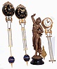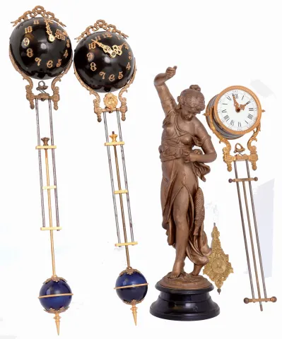 Clocks- 3 (Three) Swinging Arm Clocks and a bronzed "Fisher" spelter figure: one arm is antique French, with "GLT" stamp on movement; the two ball tops are modern reproductions; the figure is an old Ansonia side piece. 19th and later 20th centuries the old French swinging arm is in good overall condition but is missing its top crest, is broken at the bottom, and was not tested. The two dark blue Chinese swingers appear to be complete and in good condition, but again were not tested. The figure has been painted, has a repaired uplifted arm, and is missing her trident; Ht 18". The arms are all about 23" long. Sold as is, no further details available