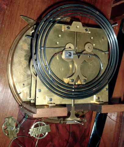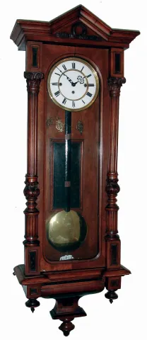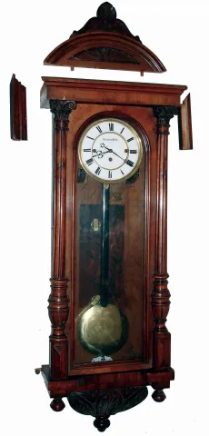 Clocks- 2 (Two) German and Austrian walnut, 8 days, 3 weight quarter striking Vienna regulator wall clocks, 1 dial signed "Ferdinand Helm, Wien", unsigned movements; c1890 the cases have old surfaces and are mainly complete, but one is missing a top piece on which its crest would mount. One side glass is broken, one dial has hairlines, one door has an age split, and there are minor veneer losses. No weights. Not tested, sold as is with no further details available. Hts 48" and 46"