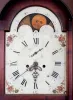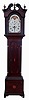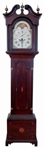 American tall clock, 8 days, time and strike, weight driven brass movement in an inlaid cherry case with broken arch top with carved rosettes, hollow carved corner columns and brass capitals, inlaid trunk with corner and center fans and inlaid plinth with