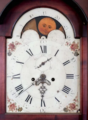 the clock has an old finial There are two cracks above trunk door and damage to the left corner molding beneath the broken arch. One of the rosettes a...