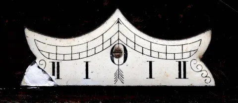 the top trim of the case was recently made by a good cabinet maker to match the style and color of the clock; it has some open grain, but is pretty good. All 6 finials are newly turned. The movement is a high quality bench made movement, on its original repaired seat board. Seat board broke at some point and has been reinforced, and needs additional attention. One thumb nut on the beat-set has been replaced. Hands are original. Pendulum bob has some small dents. Overall a good looking clock that will respond to some TLC. Ht 57"
