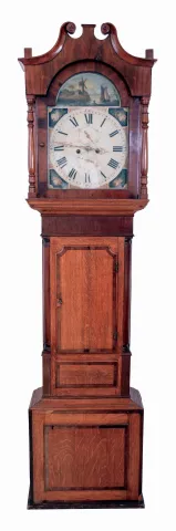 Tall clocks- 2 (Two) English / Scottish: (1) W. Moorhouse, England or Scotland, tall clock, 8 days, time and strike, weight driven movement in an oak case with mahogany banding and painted metal dial, c1840; (2) I. Wilson, Sheffield, England, tall clock,