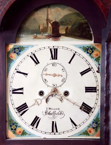 Tall clocks- 2 (Two) English / Scottish: (1) W. Moorhouse, England or Scotland, tall clock, 8 days, time and strike, weight driven movement in an oak case with mahogany banding and painted metal dial, c1840; (2) I. Wilson, Sheffield, England, tall clock, 8 days, time and strike, weight driven movement in an oak case with mahogany veneers, stringing, and with marquetry shell in trunk door, painted metal dial, c1840 (1) the case has been refinished and several large pieces of veneer banding are absent. The dust cover on the back of the hood is absent. Ht 86" Width 22" (2) case with an old finish, splits, old repairs, losses to veneer and inlay, dial cleaned, and with touch ups. Ht 90" W 20 1/2"