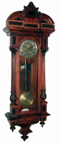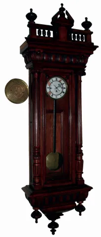 Clocks- 2 (Two) 3-weight walnut Vienna regulator, 8 day wall clocks, plus one extra 3-train movement, c1890 the larger clock has a detached but present top side molding, and one of four movement mount posts is absent. All three glasses are okay, and there is an extra movement with this case, probably because the white enamel dial of one is badly damaged. The smaller clock has a broken front glass and several detached case pieces, but appears to be nearly complete. Both crests are present, but no weights. Sold as is, no further information available. Hts 72" and 55"