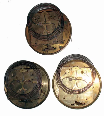the larger clock has a detached but present top side molding, and one of four movement mount posts is absent. All three glasses are okay, and there is an extra movement with this case, probably because the white enamel dial of one is badly damaged. The smaller clock has a broken front glass and several detached case pieces, but appears to be nearly complete. Both crests are present, but no weights. Sold as is, no further information available. Hts 72" and 55"