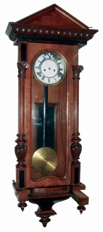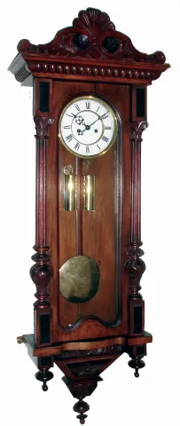 Clocks- 3 (Three) German walnut 2 weight, 8 days, Vienna regulator wall clocks, 2 are by Gustav Becker, c1900 all three are mostly complete and original condition with old surfaces and top crests, but some with loose joints and age splits. One has badly flaked dial and missing hands and weights, one missing seconds hand. Sold as is, no further details available. .Hts 47", 47" and 49"