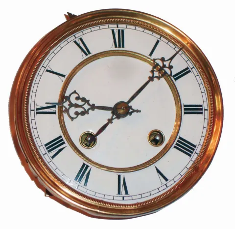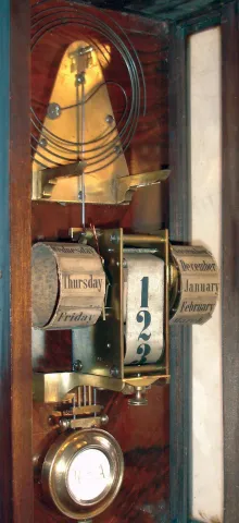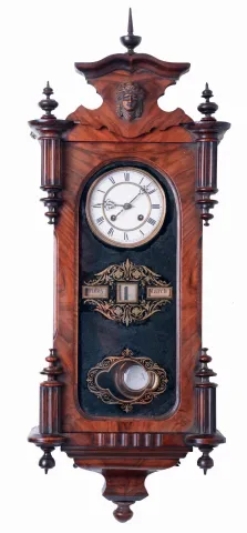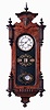 Germany, calendar wall clock, 8 days, time, strike and perpetual calendar, spring driven movement in a mahogany case with white enamel dial and reverse painted glass, c1870