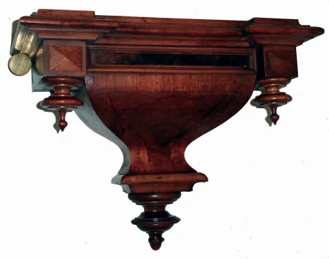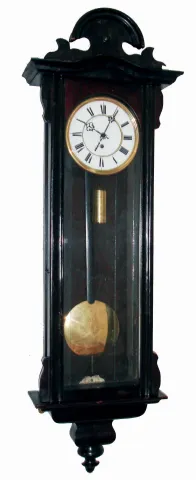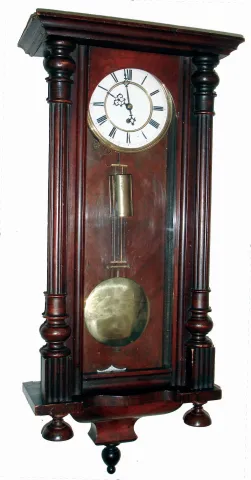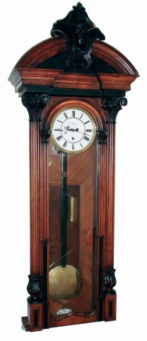 Clocks- 3 (Three) German walnut, 8 days, 1 weight time only Vienna regulator wall clocks; one movement marked Becker, the other two are unsigned; one dial is signed "Ed. Dorninger in Graz"; c1890 one front glass is broken, one top crest and one weight pulley are absent, some side glasses are loose, one set of hands is incorrect, and one case needs its entire bottom section reattached. The finishes are old and worn. Sold as is, no further details available. Hts 51", 36", and 44 1/2"