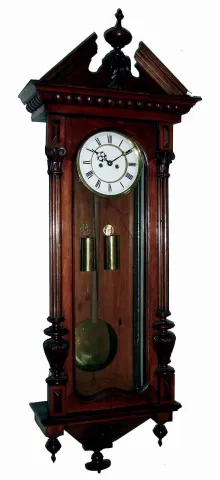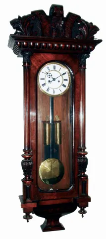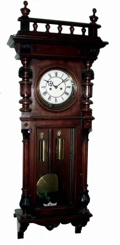 Clocks- 3 (Three) Gustav Becker, Germany, walnut 2-weight, 8 days, time and strike Vienna regulator wall clocks, c1890 all three appear mainly complete with just minor losses to veneer, finials tips, etc. One is missing its bottom finial. All glass panels are present and intact. The movement back plates have the Becker stamps. The brass pendulums and weight pairs have shiny finishes. Sold as is, no further information available. Hts 48", 47" and 47"