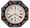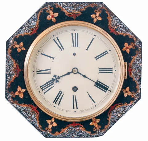 Litchfield Manufacturing Company. Litchfield, Conn. gallery wall clock with a paper mache case with M.O.P. inlay and a spring driven, 8 days timepiece movement, c1852.
