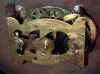 Litchfield Manufacturing Company. Litchfield, Conn. gallery wall clock with a paper mache case with M.O.P. inlay and a spring driven, 8 days timepiece movement, c1852. Black painted paper mache case in nice condition with MOP and original decoration. Original dial has been repainted and the movement adjustment hand is missing and S/F was omitted in repainting. The remaining hands are old, but not proper. The movement, designed by Samuel Botsford and manufactured by Mathews. Jewell & Co., of Bristol, is signed Litchfield. Ht 12".