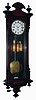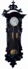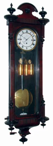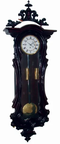 Clocks- 2 (Two) German walnut 3 weight quarter striking, 8 days, Vienna regulator wall clocks, one with serpentine case, c1900 both ornate cases are in good condition with old finishes. The wooden top crest of the serpentine case is broken, but complete. There are other minor dings and losses, but all glasses and weights are present. The movements are unsigned. One porcelain dial, with some hairlines, has an indistinct retailer name. Sold as is, no further details available. Hts 54" and 45"