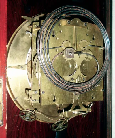 both ornate cases are in good condition with old finishes. The wooden top crest of the serpentine case is broken, but complete. There are other minor dings and losses, but all glasses and weights are present. The movements are unsigned. One porcelain dial, with some hairlines, has an indistinct retailer name. Sold as is, no further details available. Hts 54" and 45"