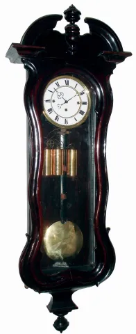 Clocks- 2 (Two) German walnut 3 weight, 8 days, Vienna regulator wall clocks, one serpentine, one Gustav Becker, c1890 the cases appear complete with old finishes and all glass panels, except for some minor trim pieces missing from the top crest of the Becker which also has no weights. The Becker movement is signed, the other unsigned. Sold as is, no further details available. Hts 47" and 49"