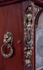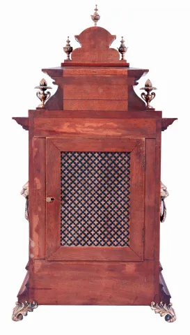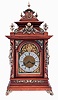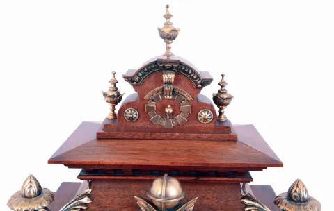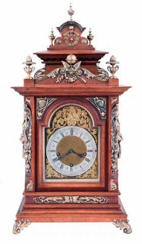 Lenzkirch, Germany, bracket clock, walnut case mounted with extremely ornate brass castings, including salamanders, half caryatids, lion mask handles, and more, composite dial with applied, art nouveau inspired gilt ornament, Roman numeral, silvered chapter ring, blued steel hands, 8 days, three train repeating movement, striking ting tang quarters on gongs, serial #950914, c1895 case in an old finish, cleaned, mounts polished, top center finial replaced, needs a little extra stain to match, dial with minor discoloration, hands with minor oxide, ticks and strikes, movement will need adjustment, as hours sometimes sound with quarters, A large and impressive clock. 26"h x 13"w