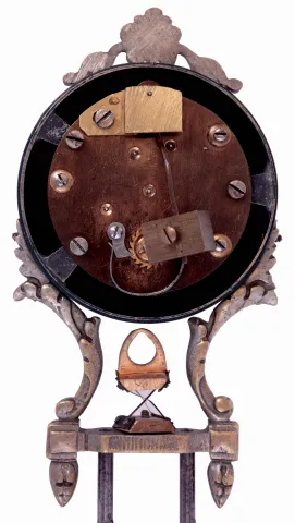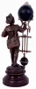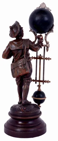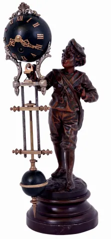 Miniature French Swinger, signed "Aug. Moreau", the patinated spelter figure of a young boy wearing a tam-o-shanter cap, and with a bag slung over his left shoulder, his right hand raised and supporting the miniature swinging timepiece, 8 day, key wound movement contained in a dark green sphere with gilt Roman numerals and Louis XV hands, and 3 rod "gridiron" terminating in a smaller green sphere with gilt equatorial band, c1890 figure retains original patina with minor losses, left pinky finger missing, base with minor dents, clock retains original green finish with minor losses, nickel plating with minor wear, ticking, suspension springs with minor distortion, will need service and adjustment in order to run reliably. Ht 12"