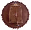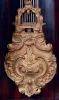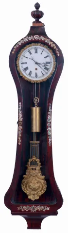 Austrian, unusual small single weight Viennese timepiece in a stylized figure 8 case with mother of pearl floral decorations to the door, the movement with a white glass dial and cast brass bezel, c1850 It appears to us that the French cast pendulum has been adapted to the case, and although it looks attractive, the clock started life with a wooden rod and brass bob. To bring the dial closer to the glass, cardstock shims have been added under the mounting bracket. The well made movement has Harrison style retaining power. 2 small trim moldings lacking at top. No winding crank. Delicate hands are original. Ht 32"